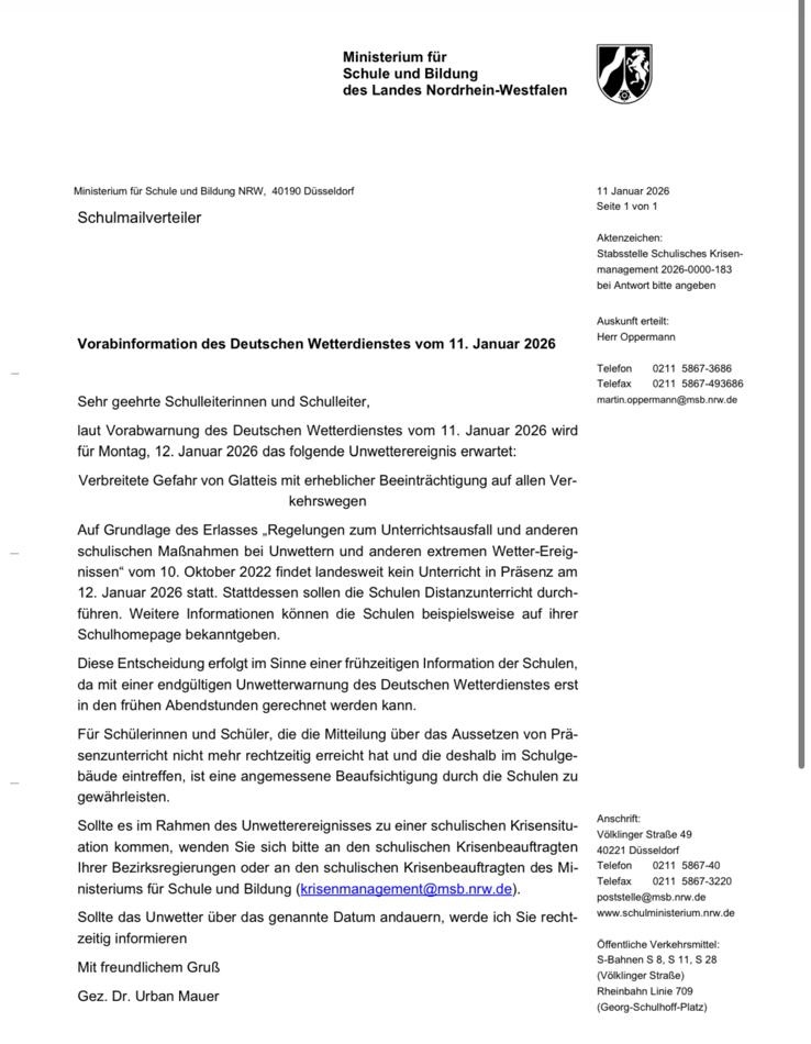 wir möchten Sie darüber informieren, dass für morgen vom Ministerium für Schule und Bildung (MSB) Distanzunterricht angeordnet wurde. Dies bedeutet, dass die Schülerinnen und Schüler nicht in der Schule erscheinen, sondern von zuhause aus lernen. Die Klassenlehrerinnen werden Ihre Kinder mit den notwendigen Aufgaben versorgen, damit das Lernen auch im Distanzunterricht effektiv fortgesetzt werden kann. Bitte achten Sie darauf, dass Ihr Kind Zugang zu den benötigten Materialien hat und bei Fragen jederzeit Kontakt zu den Lehrkräften aufnehmen kann. Sollten Sie technische Unterstützung oder weitere Informationen benötigen, stehen wir Ihnen gerne zur Verfügung. Bitte bestätigen Sie uns per Schnellumfrage,dass Sie diese Nachricht erhalten haben und informieren sie die Eltern in den WhatsApp-Gruppen. Wir danken Ihnen für Ihre Unterstützung und Zusammenarbeit in dieser besonderen Situation.